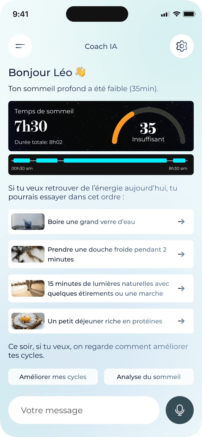Un coach IA personnalisé vous accompagne pas à pas : conseils adaptés, motivation au quotidien et recommandations ajustées à votre rythme de vie.